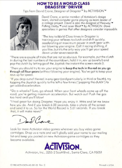 That’s right. They created a functional demo where you use the joystick to move the blinds up and down. Atari’s lawyers were not amused. Atari eventually lost and Activision released their first four games in mid-1980. The differences were immediately noticeable. For one thing, the black borders reduced color bleeding and it was generally held that Activision’s games had better graphics (mirror) than those of Atari’s own. It helped that all of its designers were among Atari’s best. David Crane in particular was the John Carmack of his day, polishing code to a mirror sheen. Activision always gave its designers credit and their manuals featured a page-long note of advice to players.