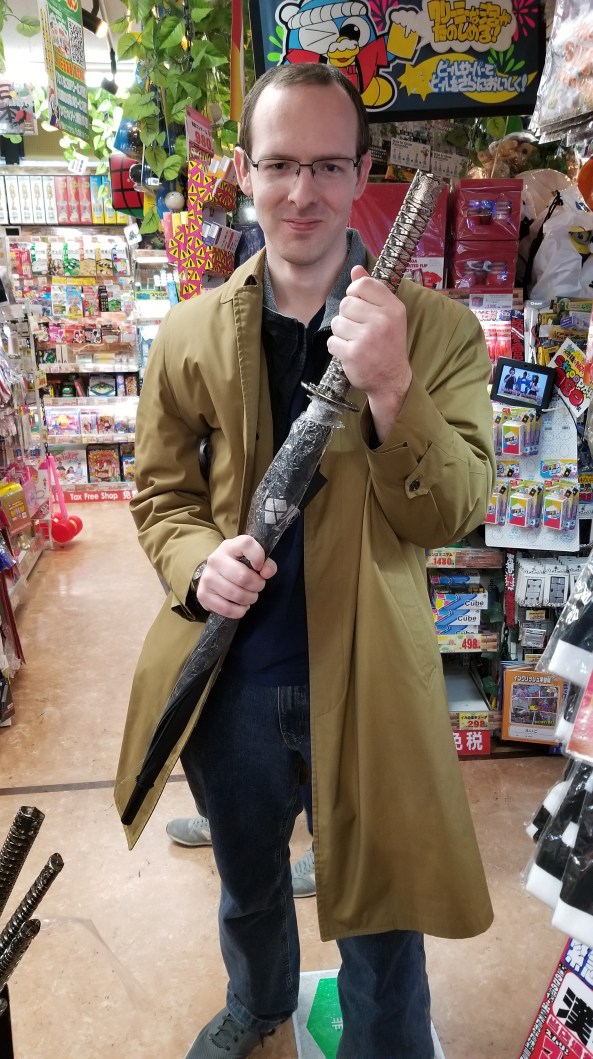 Including an umbrella shaped like a katana.