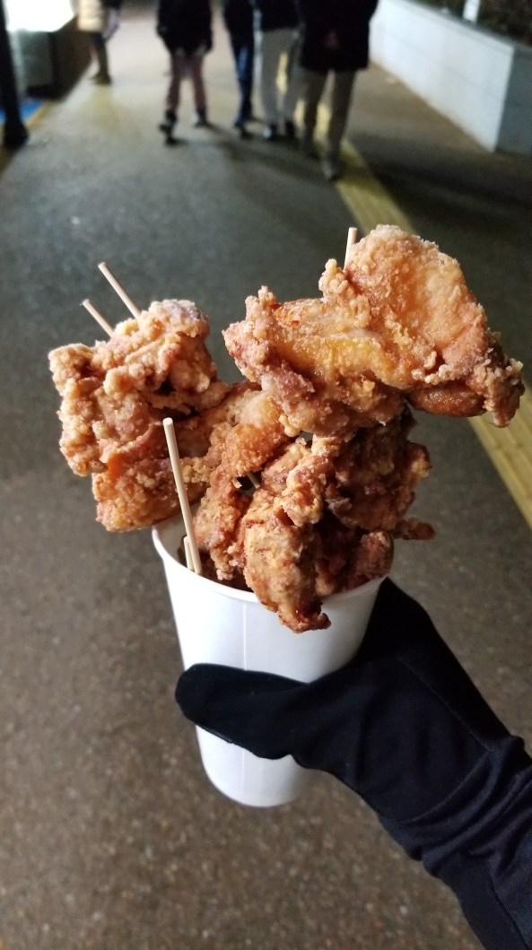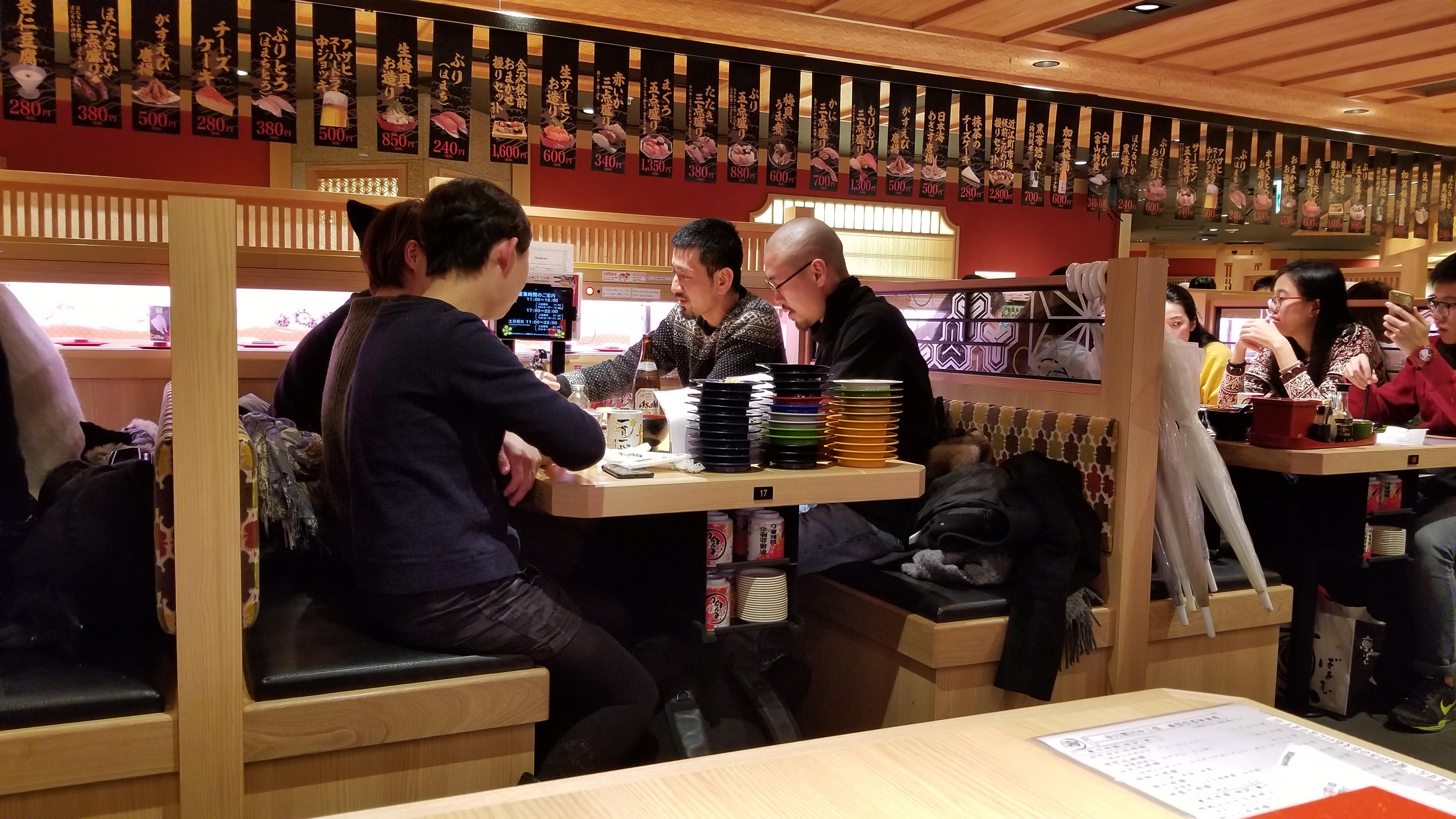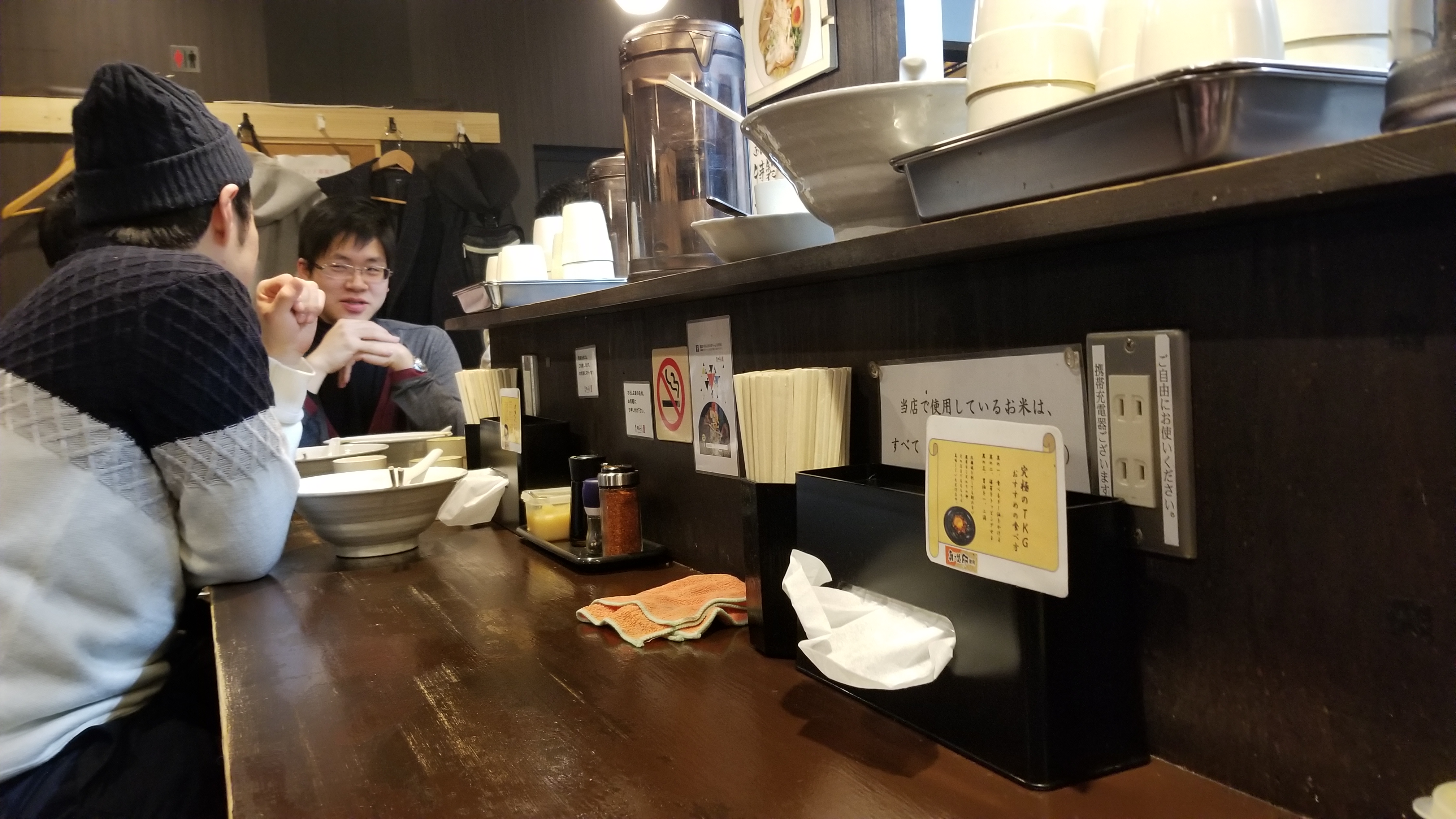 Something cool happened while I was eating. A family came in and the father started talking to one of the servers. I barely understood anything he said, but I did hear the words 「四人ですけど。」(“We’re four persons”). I looked and noticed that there were three empty seats next to me and one empty seat to my left. Then I realized what was going on and and moved over so that the four empty seats were together. Everyone was very appreciative. Man, I’m glad that I caught those last two words. I understood little else.